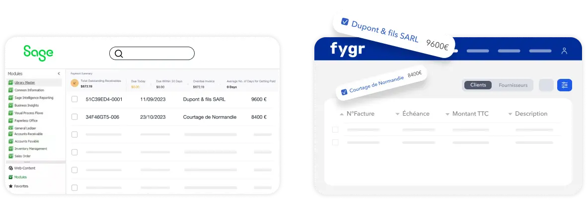 Une fois les comptes connectés, chaque mise à jour d'échéance dans Sage 100 impacte automatiquement le prévisionnel de trésorerie de vos clients dans Fygr.